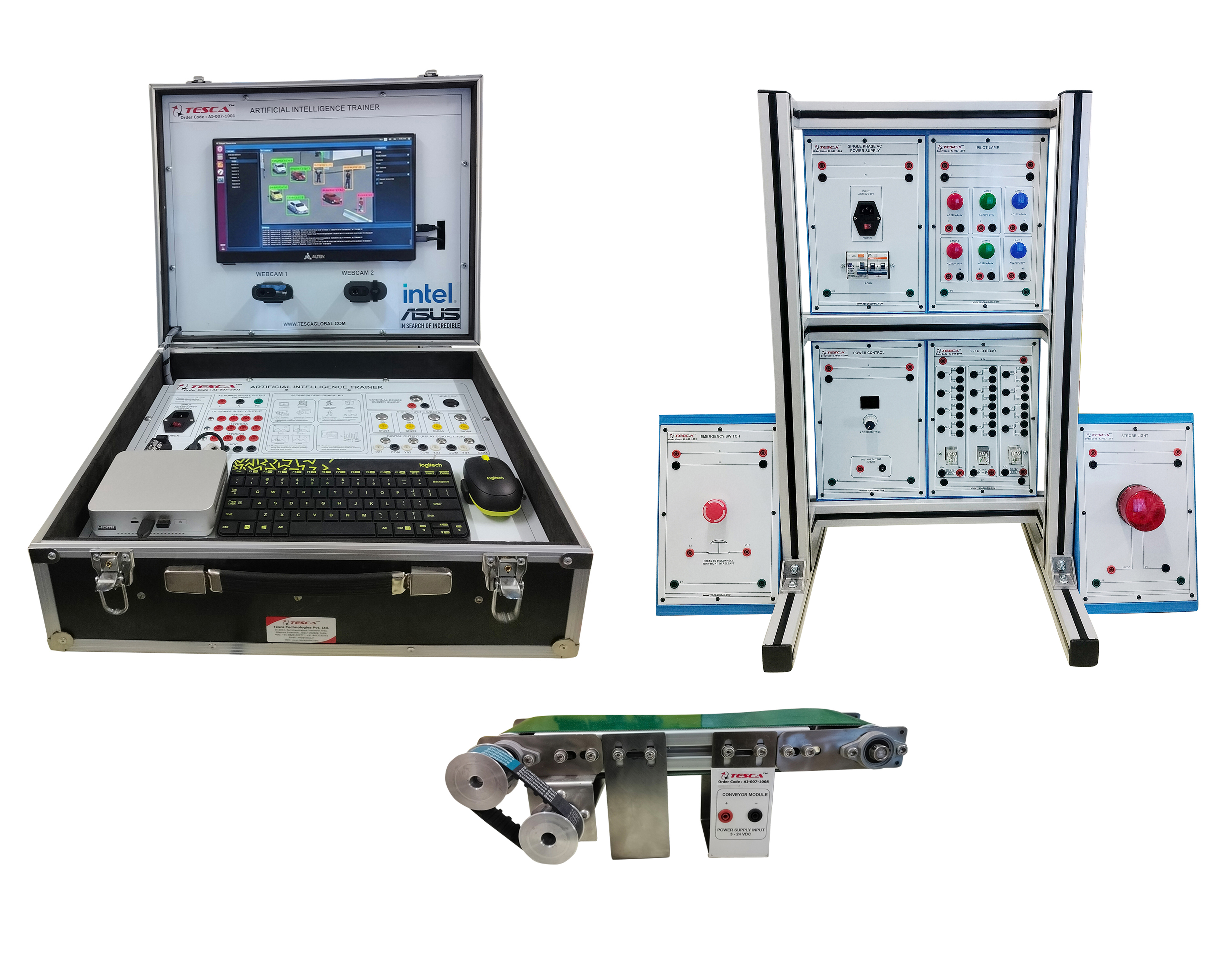 Artificial intelligence (AI) refers to the simulation of human intelligence in machines that are programmed to think and act like humans. It involves the development of computer systems and software that can perform tasks that would typically require human intelligence, such as learning, problem-solving, decision-making, speech recognition and face recognition. The Artificial Intelligence Trainer consist of: AI CPU Intel CPU Ultra, 2 Camera, Keyboard and Mouse Wireless, 15.6" Touch Screen Industrial Monitor and 4 input 4 output General Purpose Input/Output (GPIO).