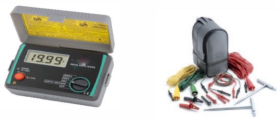 RCD tester used for measures earth/ground resistance using 2-, 3-, 4-pole fall-of-potential or clamp/ stakeless methods — used for DB, lightning protection and grounding verification.