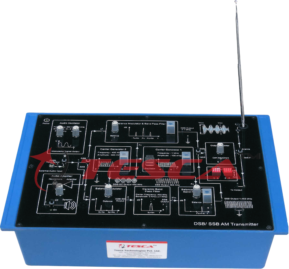 40520 DSB/SSB AM Transmitter Trainer is a comprehensive learning solution specifically designed to study basic operation as well as to provide conceptual and step by step understanding of DSB/SSB Amplitude modulation and transmission system through measurement of voltages and observation of waveforms at various test points. Block wise modular organization of circuit function with supporting technical information makes it easy to understand the process of AM generation and transmission. The exercises conceived to provide a practical approach to the subjects enable a deep analysis of the subjects and will guide the students to understand each function.