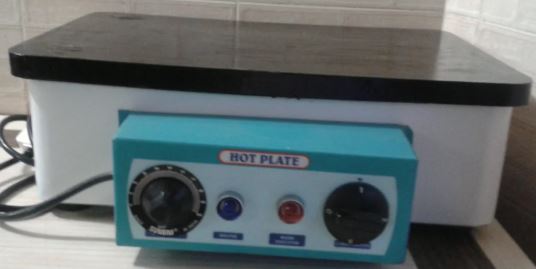 Electric hot plate Heavy MS Body powder coated with SS Top, Fitted with Energy Regulator and Rotary Switch . Hotplate to be supplied with power chord and plug to work on 220/230V AC (Temperature 250oC-300oC approx).
