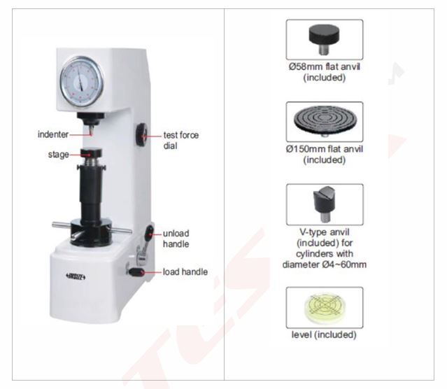 TECHNICAL SPECIFICATIONS: Hardness scale -HRA, HRB, HRC, HRD, HRF, HRG Preliminary test force-98N (10kg) Test force-588N (60kg), 980N (100kg), 1471N (150kg) Display-analogue Stage elevation-manual Load co...
