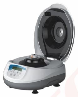 Small compact size benchtop centrifuge with limited power, generally used to perform quick spin downs and other activities related to sample preparation.