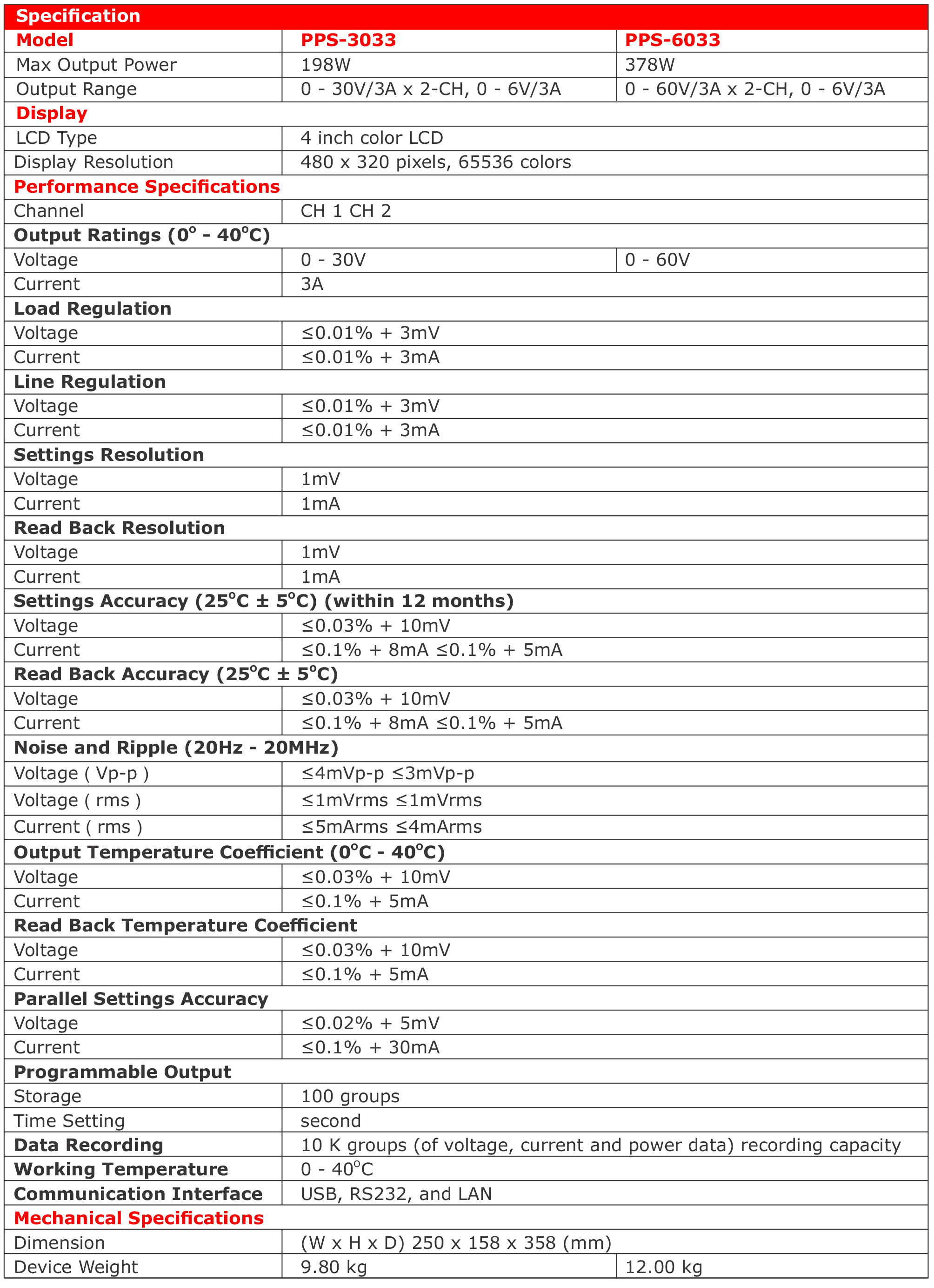 Features Three independent controllable channels Max output resolution : 1mV / 1mA Low ripples / low noise Up to 100 group timers Multi- working mode : individual, parallel, and series Over-voltage / Over-current protection Data-log...