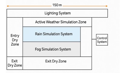 1. Rain Coverage Area Capable of generating a uniform rain effect over an area of 150 m (L) × 14 m (W). 2. Rain Intensity Control Adjustable rain intensity ranging from 15 mm/hr to 120 mm/hr. 3. Water Managemen...