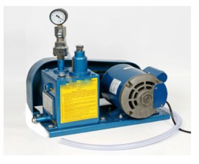 Features: Supplied complete with base, motor, pulley, and belt. Pump mechanism housed in a metal case with visible oil level and drain plug at the base. Includes non-return valve, belt gauge, and vacuum gauge with regulator. Moisture Trap...